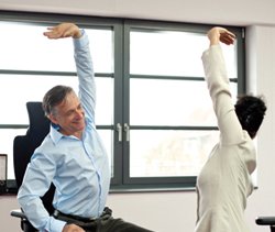 Zentrales Modul im move@work-Programm ist ein ganzheitliches Bewegungscoaching. Dabei setzen wir u. a. auf die Trainingsmethode Gyrokinesis® mit ihren dreidimensional kreisenden Bewegungen. Das Work-out braucht nicht viel Zeit und kann auch in alltäglicher Kleidung im Büro ausgeübt werden. So lässt sich move@work bestens in den Arbeitstag integrieren.